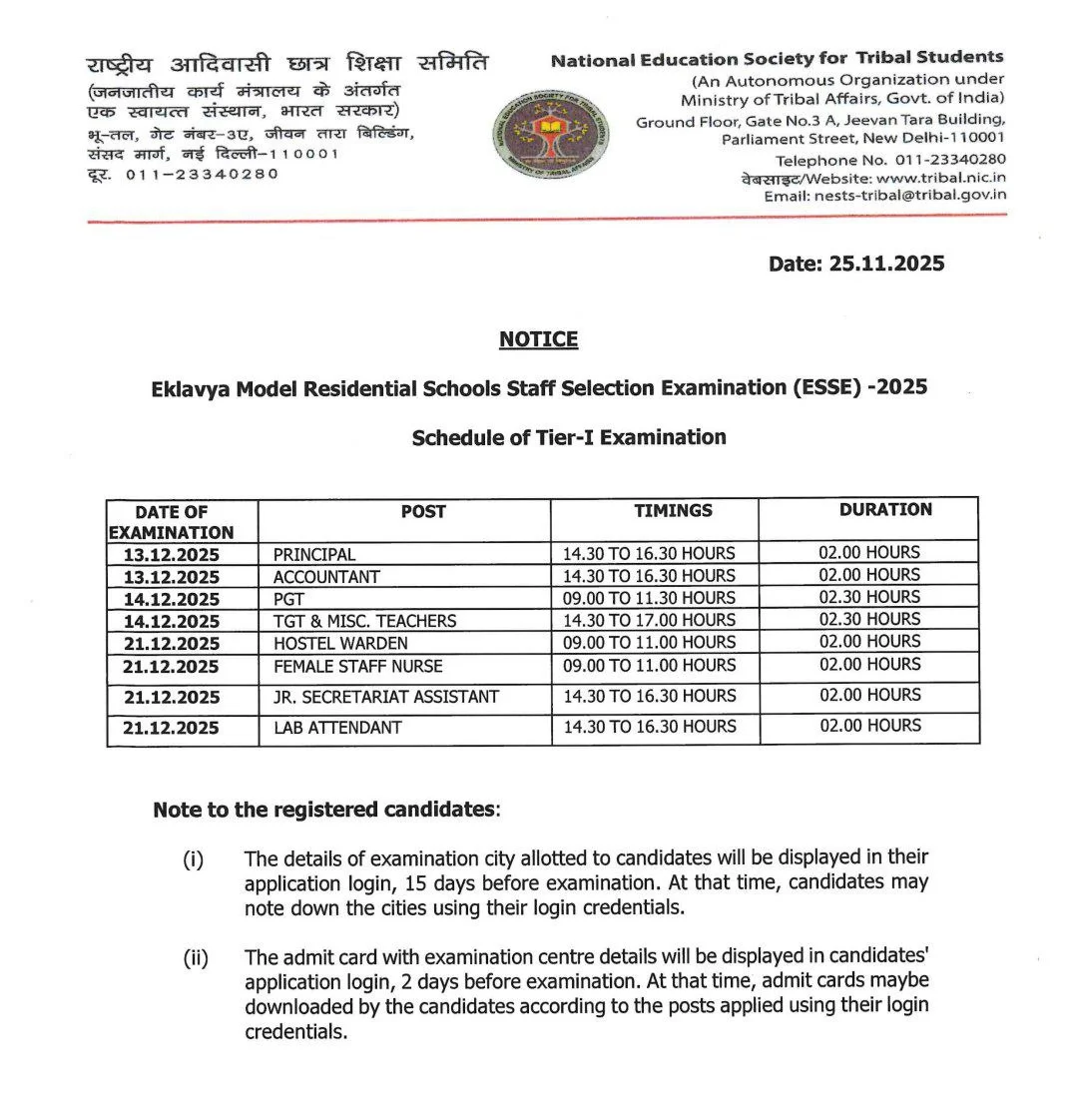 एकलव्य मॉडल रेजिडेंशियल स्कूल भर्ती के लिए परीक्षा 13 दिसंबर, 14 दिसंबर और 21 दिसंबर 2025 को आयोजित होगी इसमें 13 दिसंबर को परीक्षा दूसरी पारी में जबकि 14 और 21 दिसंबर को परीक्षा दोनों पारियों में आयोजित की जाएगी आपको बता दे की प्रथम पारी सुबह 9:00 बजे से शुरू होगी जबकि दूसरी पारी दोपहर 2:30 बजे से शुरू होगी एकलव्य मॉडल रेजिडेंशियल स्कूल भर्ती के लिए एग्जाम सिटी की जानकारी परीक्षा तिथि से 15 दिन पहले जारी की जाएगी जबकि एडमिट कार्ड 2 दिन पहले जारी किए जाएंगे।