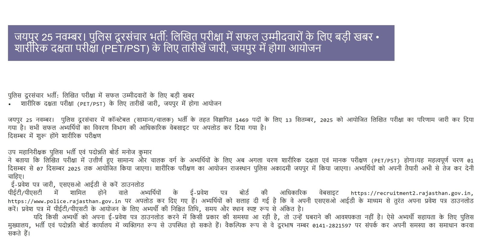राजस्थान पुलिस दूरसंचार लिखित परीक्षा में जो अभ्यर्थी उत्तीर्ण हो गए हैं उनके लिए अब अगला चरण शारीरिक दक्षता एवं मानक परीक्षण आयोजित किया जा रहा है राजस्थान पुलिस दूरसंचार फिजिकल (PET/PST) परीक्षा का आयोजन 1 दिसंबर से लेकर 7 दिसंबर 2025 तक किया जा रहा है राजस्थान पुलिस दूरसंचार फिजिकल परीक्षा का आयोजन राजस्थान पुलिस अकादमी जयपुर में किया जाएगा।