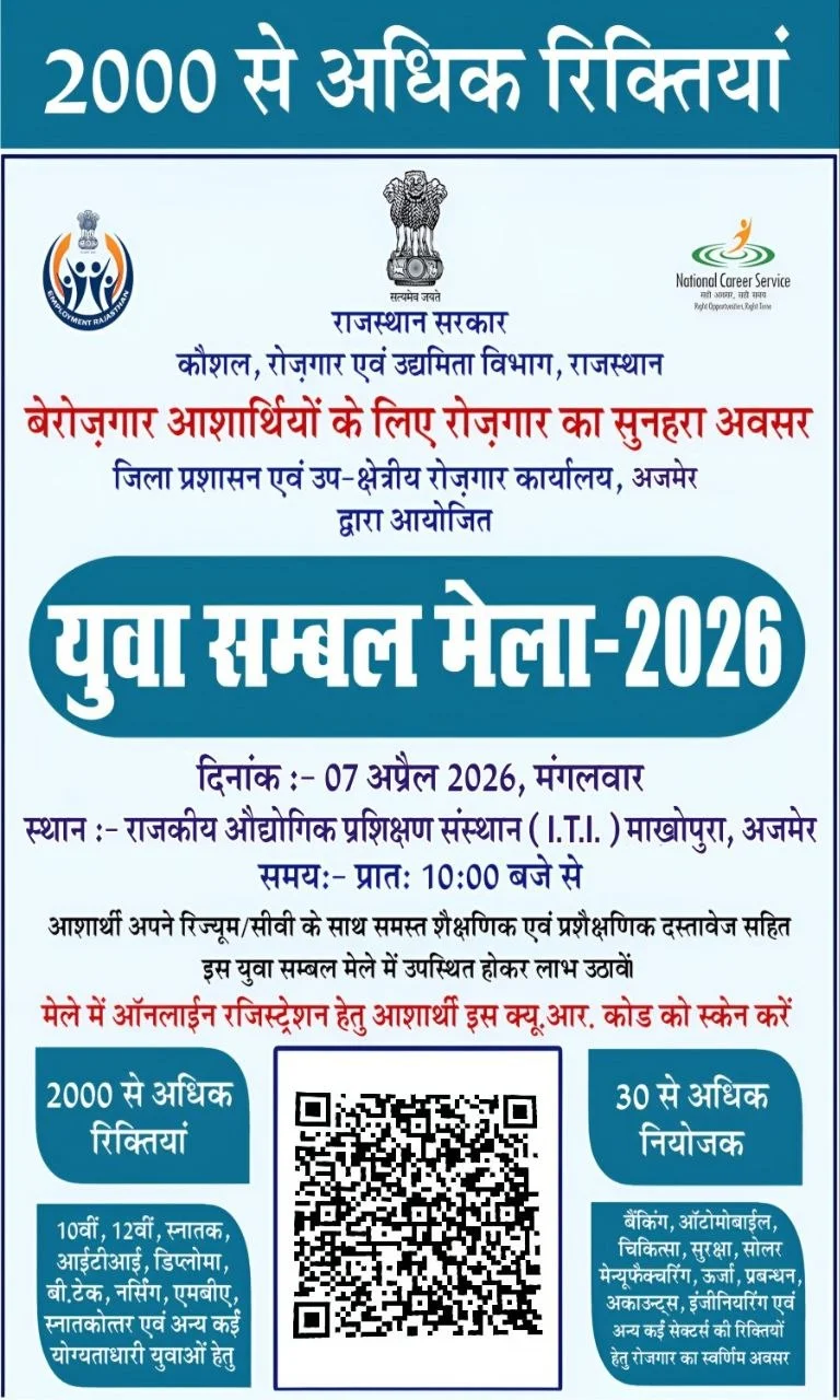 Yuva Sambal Mela 2026: कौशल रोजगार एवं उद्यमिता विभाग, राजस्थान द्वारा युवा संबल मेला 2026 का आयोजन किया जा रहा है जिला प्रशासन एवं उप क्षेत्रीय रोजगार कार्यालय अजमेर द्वारा 7 अप्रैल 2026 मंगलवार को आयोजित हो रहा है इसमें 2000 से अधिक रिक्त पदों पर साक्षात्कार और योग्यता के आधार पर चयन किया जाएगा इसमें योग्य महिला एवं पुरुष अभ्यर्थियों को राजकीय औद्योगिक प्रशिक्षण संस्थान माखोपुरा, अजमेर में प्रातः 10:00 बजे उपस्थित होना होगा।